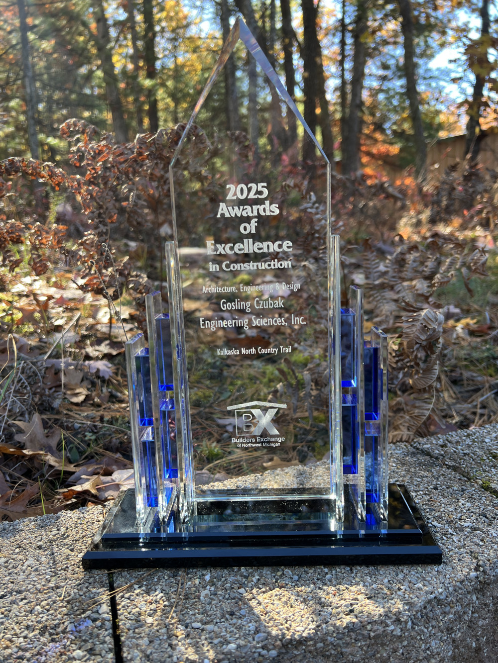 At the 2025 Builders Exchange of Northwest Michigan Awards of Excellence in Construction Ceremony, we were thrilled to receive the Architecture, Engineering, and Design Award for the North Country Trail / Iron Belle Trail Connector Project with the Village of Kalkaska DDA.